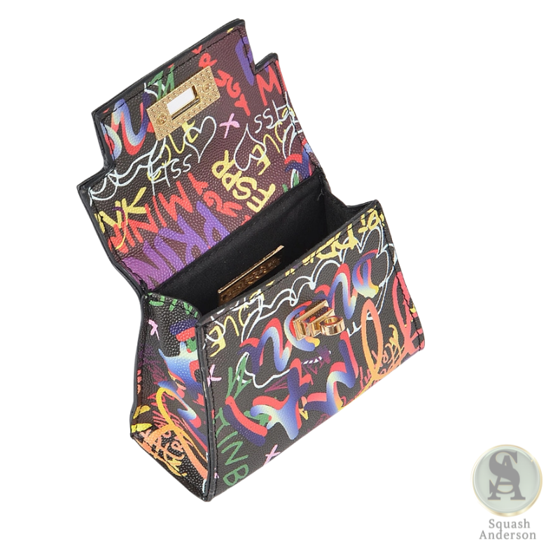Add playful street-style to your outfit with the Graffiti Mini Handle Purse. Compact and trendy, it features colorful graffiti prints on a structured silhouette with a top handle. Perfect for carrying your essentials like keys, cards, or lipstick, this mini purse is a bold statement piece for casual outings, parties, or nights out.