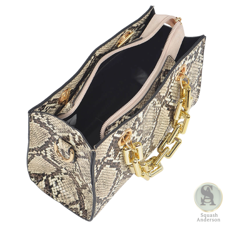 - Features: Snake print texture, gold-tone chain handles, detachable strap