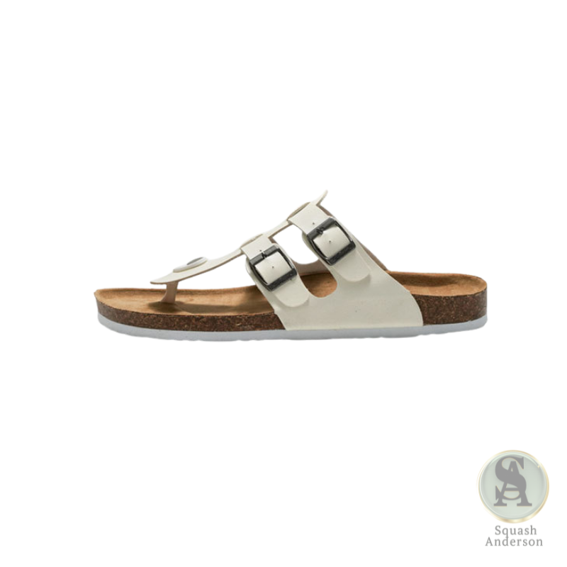Step into breezy comfort with the White Thong – Luxe Comfort Sandal. Featuring a clean white upper with dual adjustable buckled straps and a thong-style toe loop, this sandal blends modern minimalism with everyday functionality. The cushioned cork midsole and soft suede footbed provide all-day support, making it perfect for warm-weather outings, travel, or daily wear.
